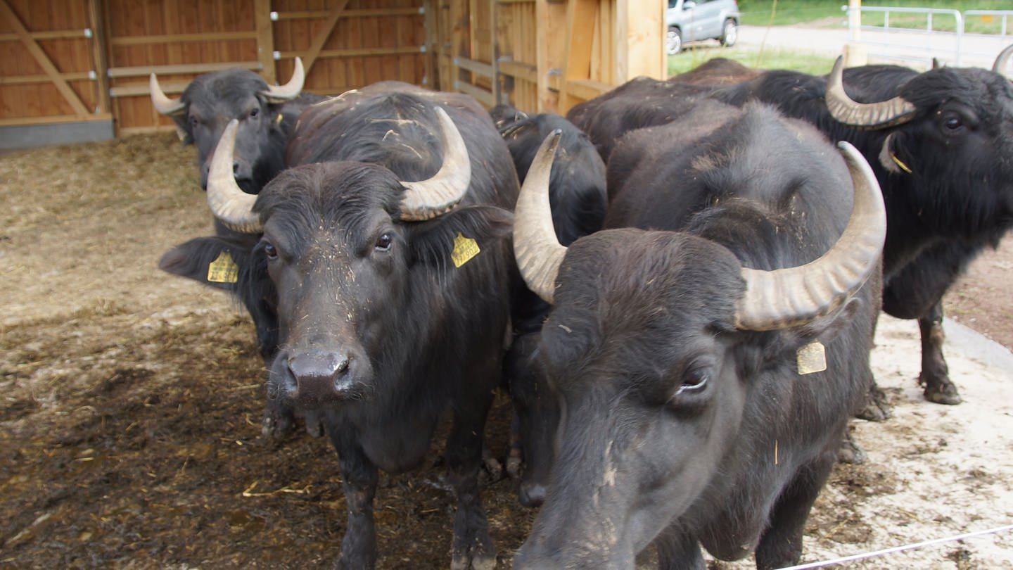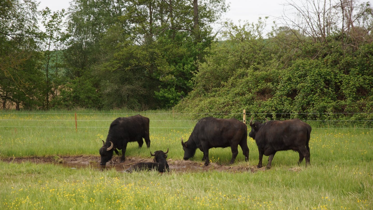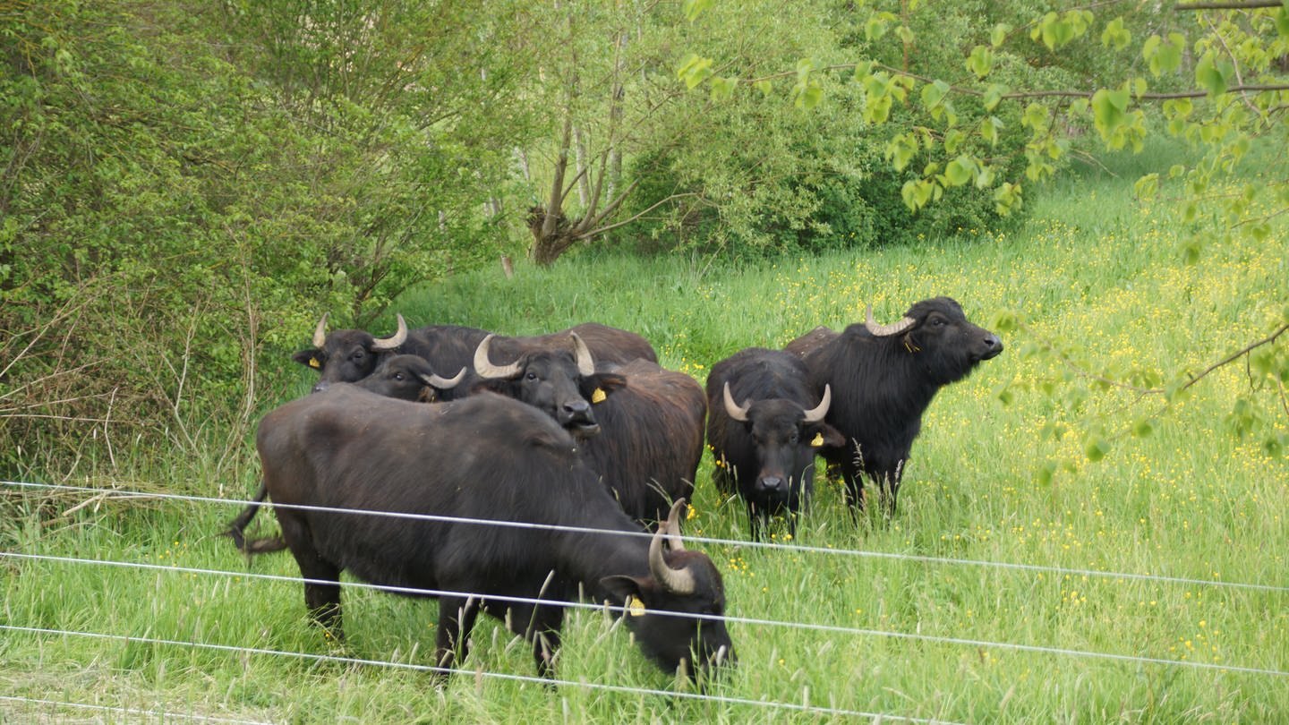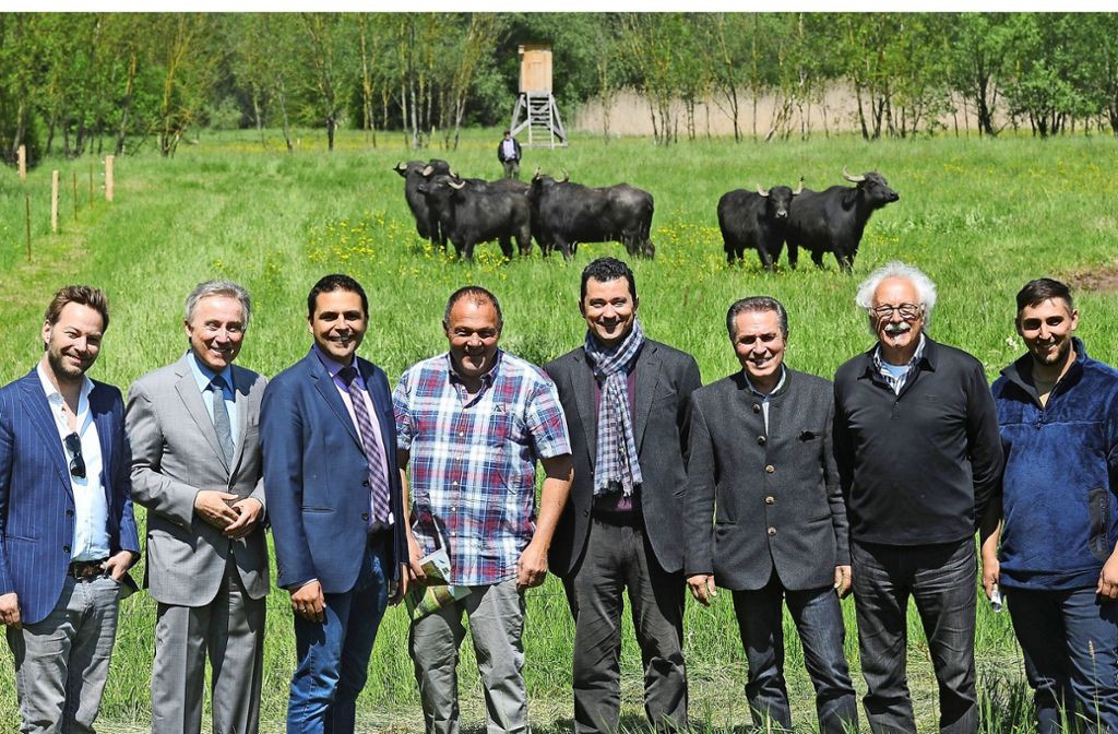 Die Projektbeteiligten freuen sich über die Ankunft der Büffel (von links): Felix Graf Adelmann vom Verein für Landschaftspflege und Naturschutz durch Beweidung im Bottwartal, Landrat Rainer Haas, Bürgermeister Ralf Zimmermann, Landwirt Andreas Weigle, Sponsorenvertreter Albert Dürr, Initiator Claus-Peter Hutter, Fördervereinsvorsitzender Gerhard Fahr, Landwirt Uli Weigle. Foto: Werner Kuhnle